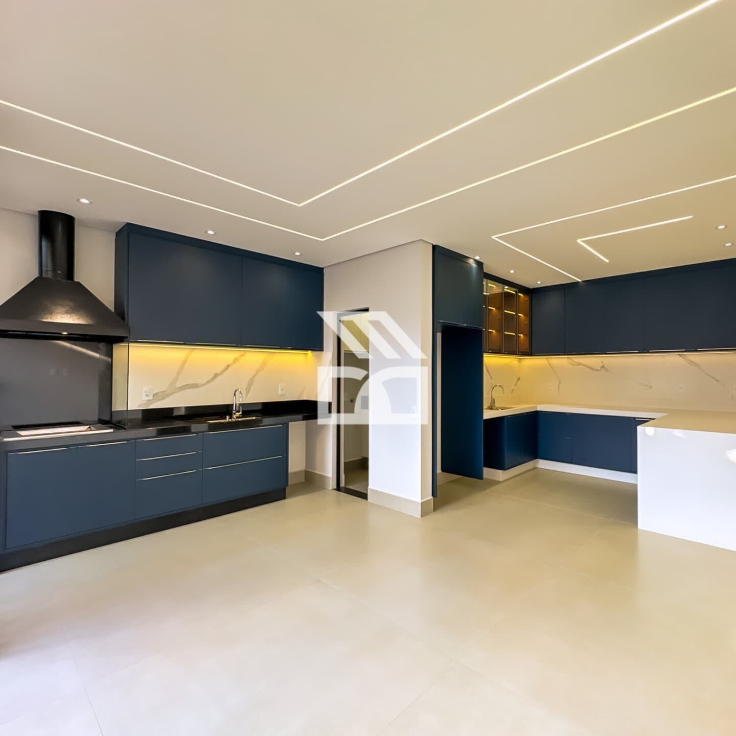 Cozinha estilo americana, integrada ao espaço gourmet com linda marcenaria planejada, despensa com prateleiras e escritório com iluminação natural.