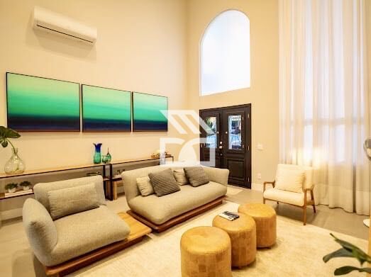 A entrada principal impressiona com a visão do living amplo com pé direito duplo, linda escada, que separa as salas de estar e jantar, com lavabo.