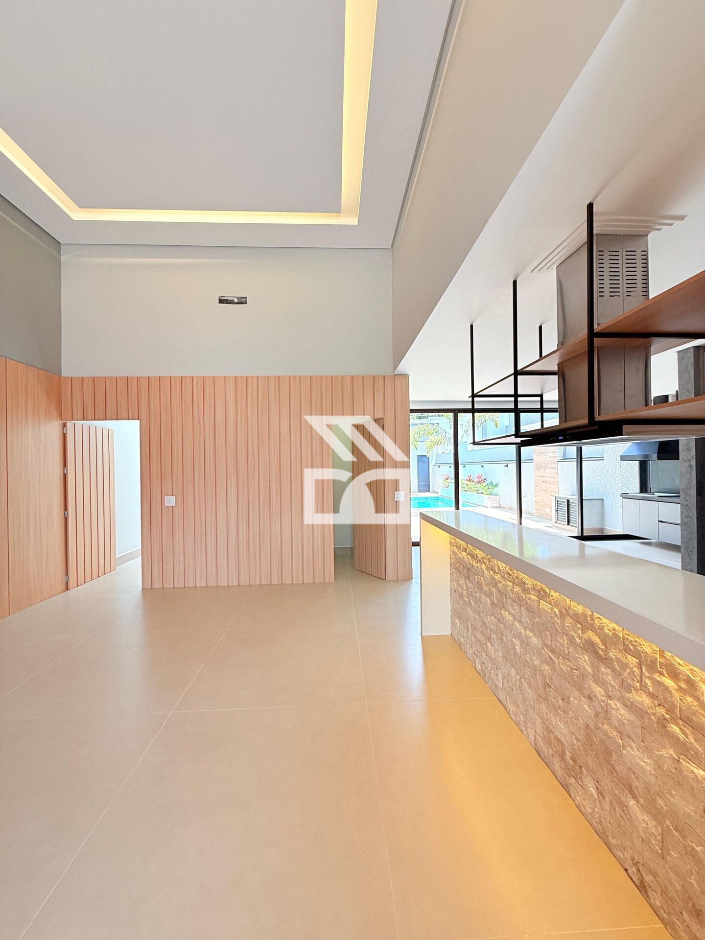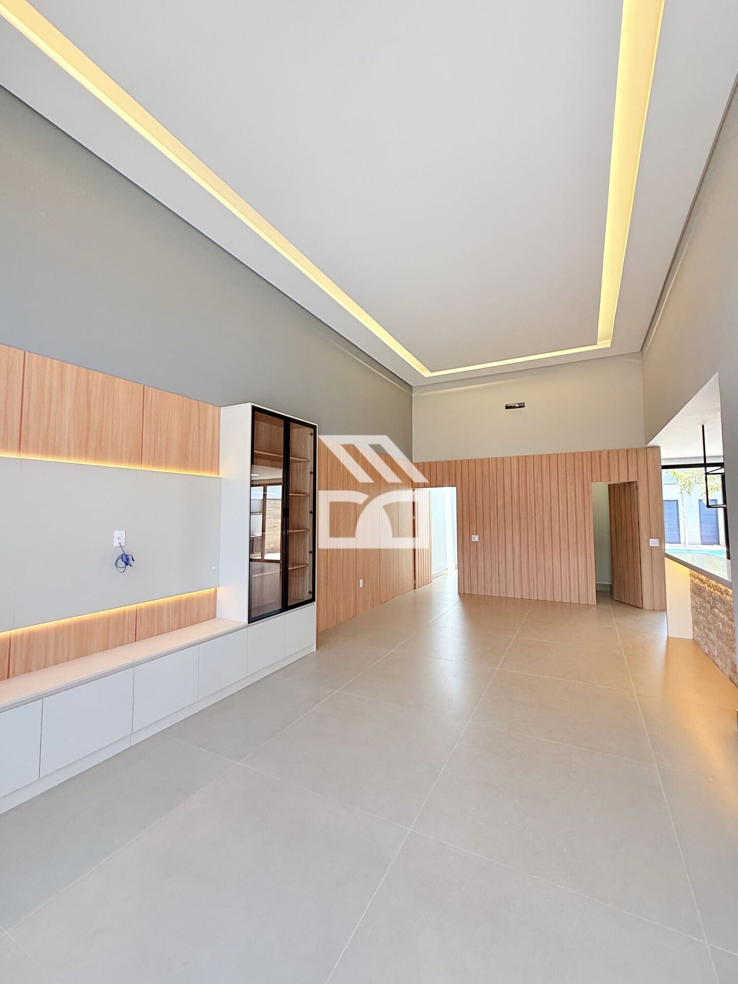 Área social em conceito integrado, sala 2 ambientes com pé direito elevado
