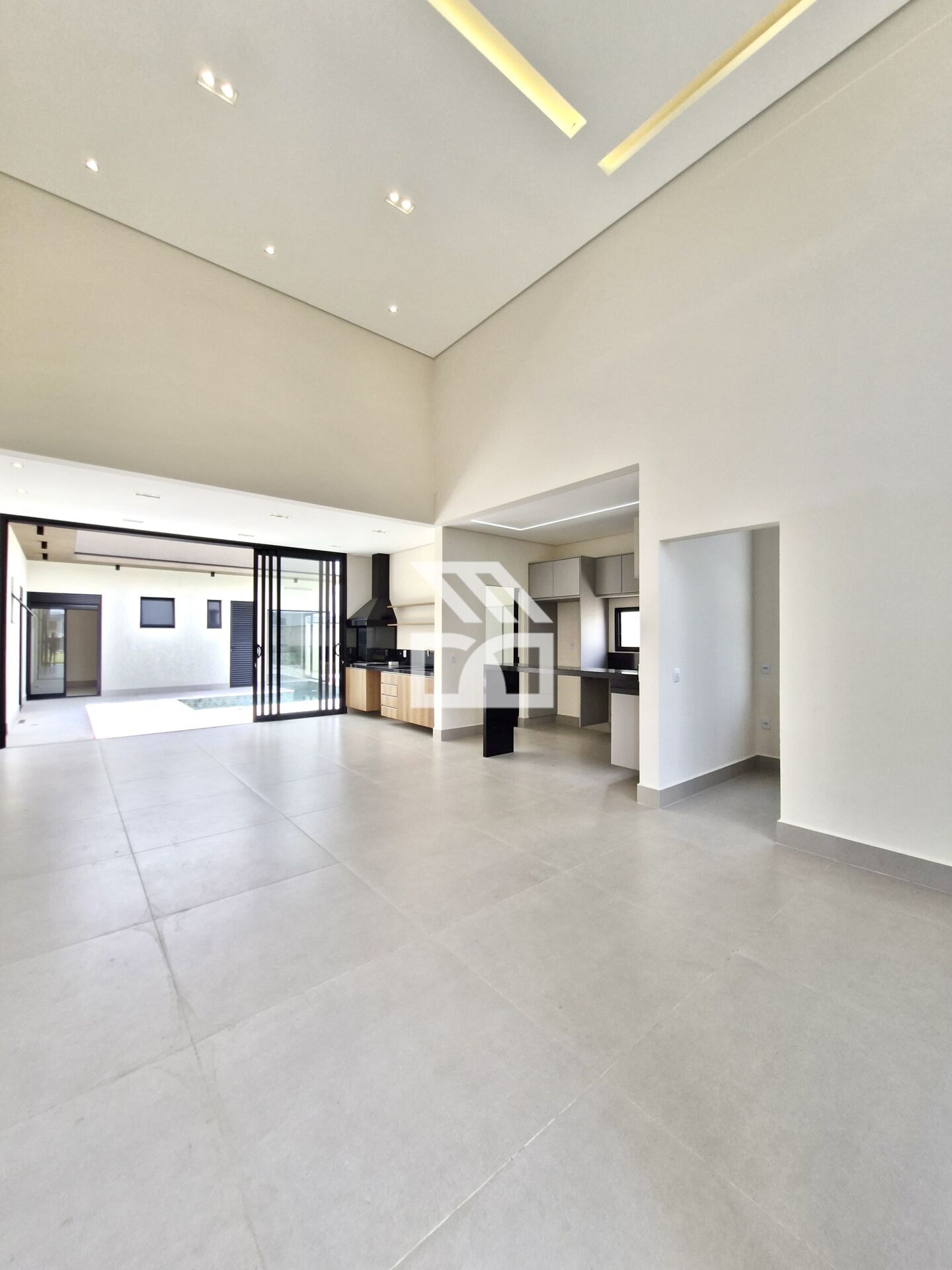Área social integrada e ampla, sala 2 ambientes com pé direito duplo
