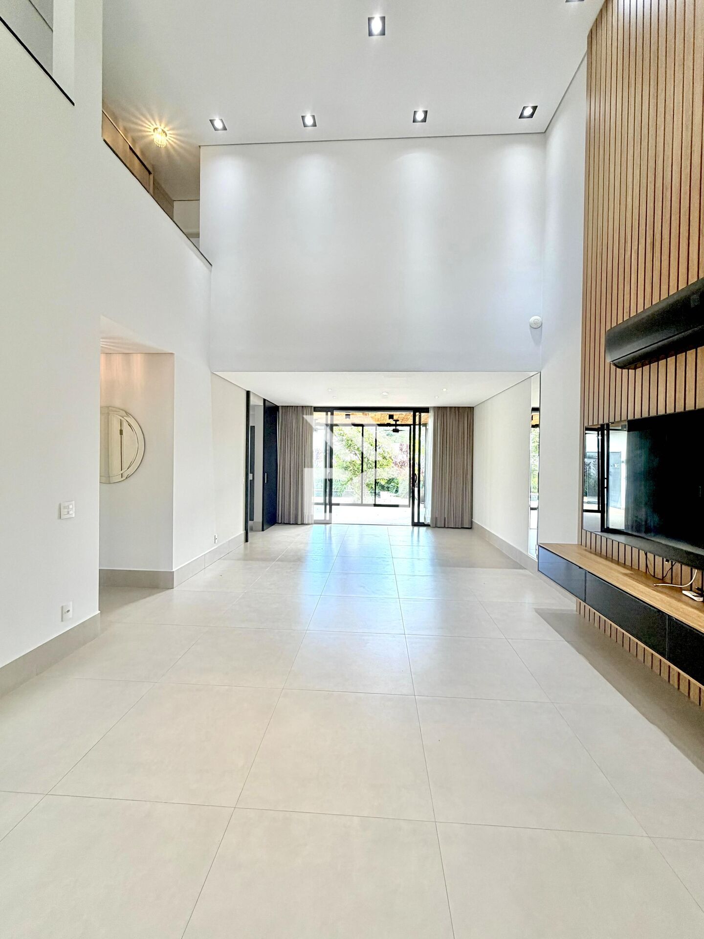 Sala 2 ambientes com home theater, telão e TV