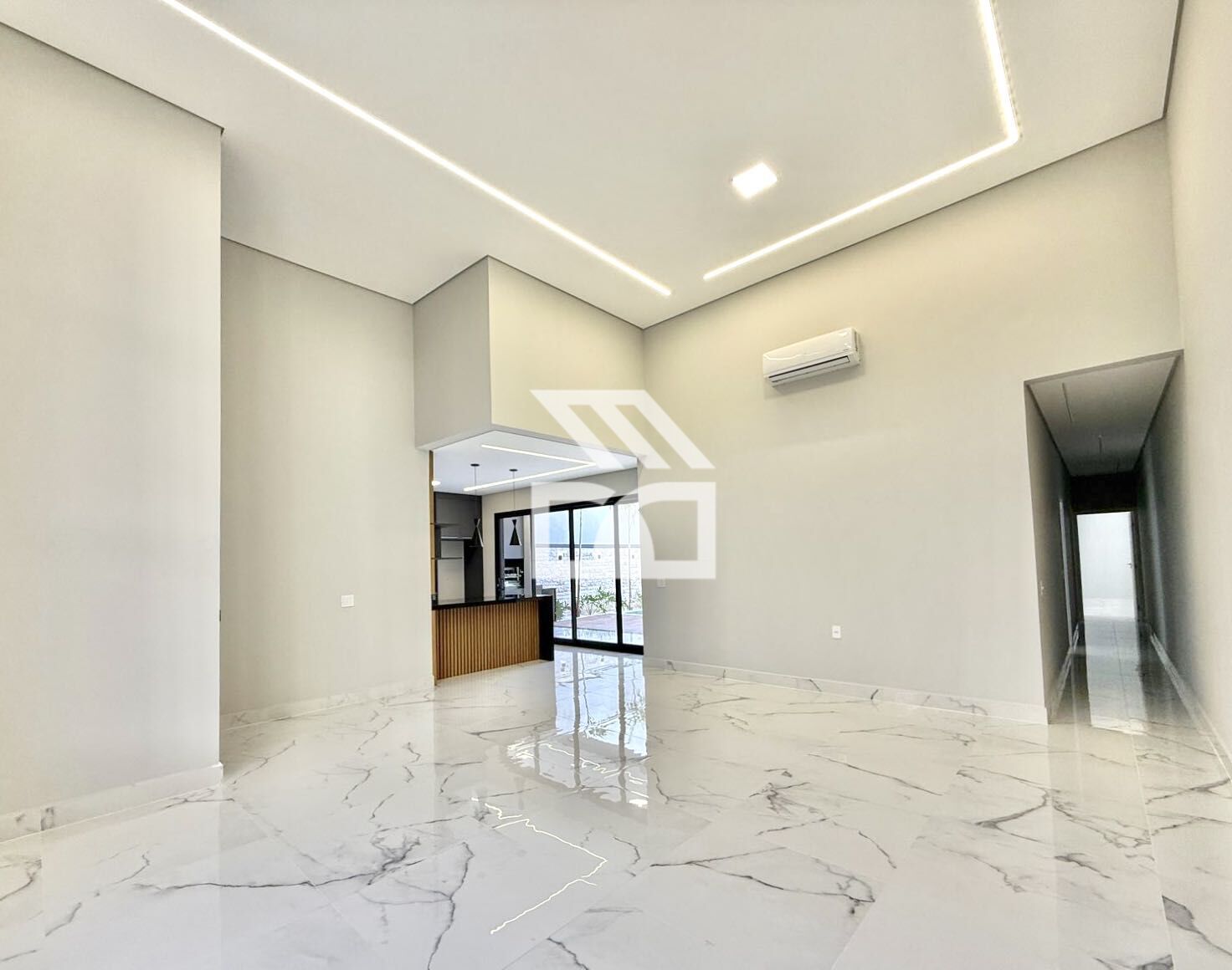 Área social em conceito integrado, sala 2 ambientes com pé direito elevado