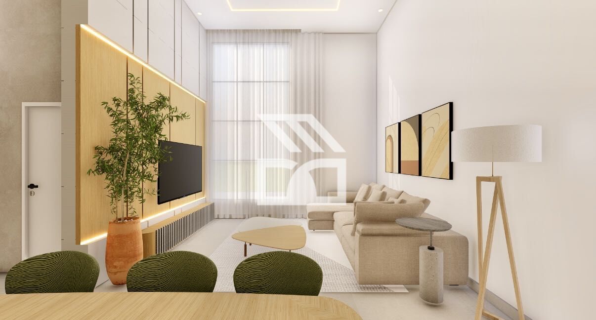Área social em conceito aberto, sala com pé direito elevado, iluminada naturalmente