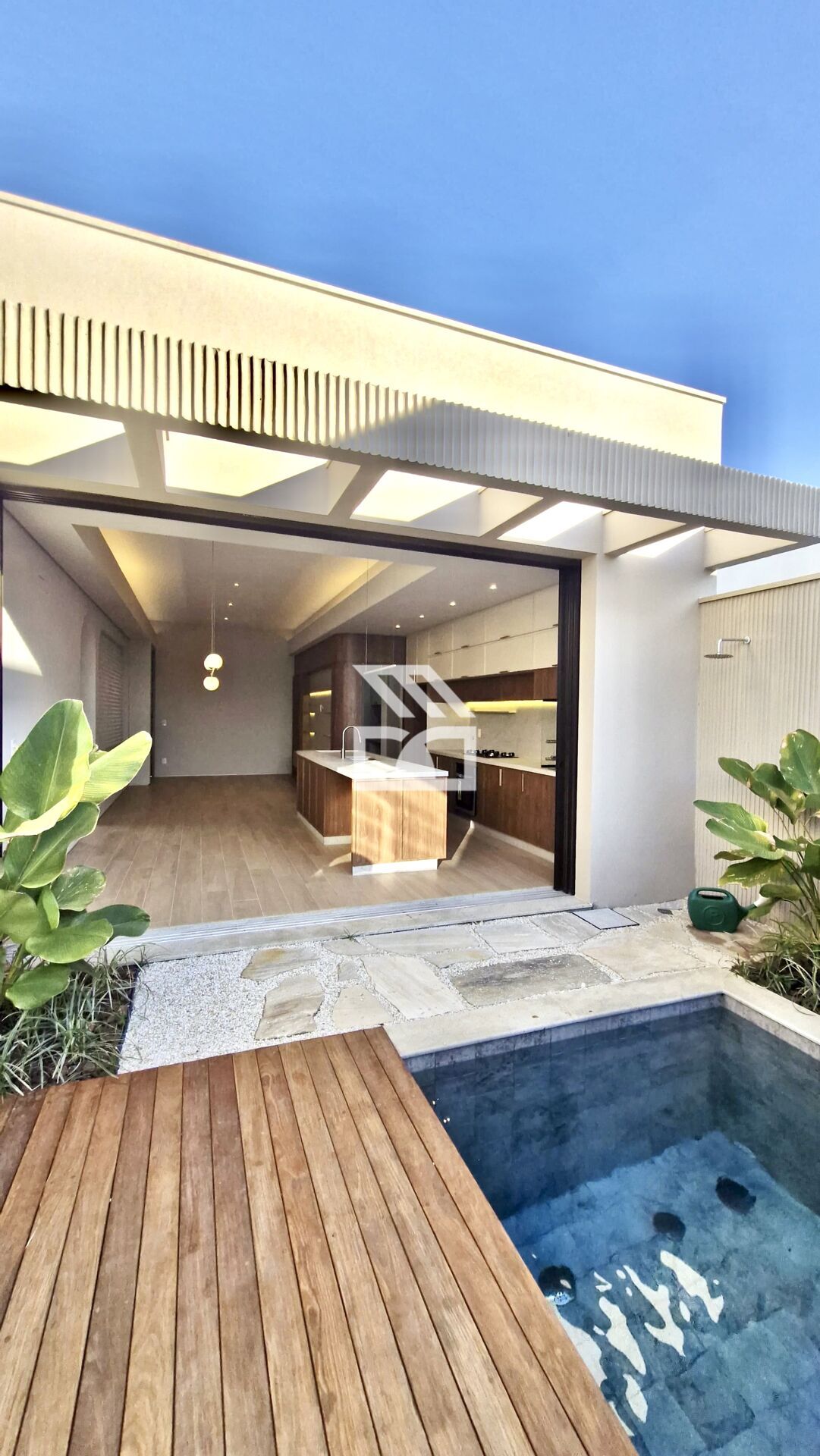 - Deck de madeira na área da piscina e paisagismo completo nos fundos.
