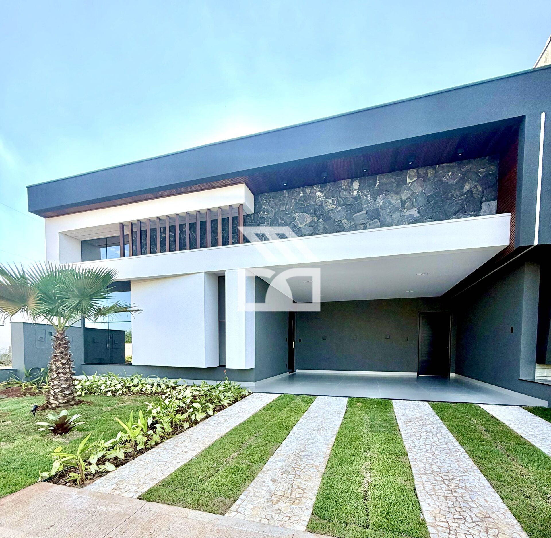 Fachada com revestimentos, detalhes em madeira e janela em pele de vidro;