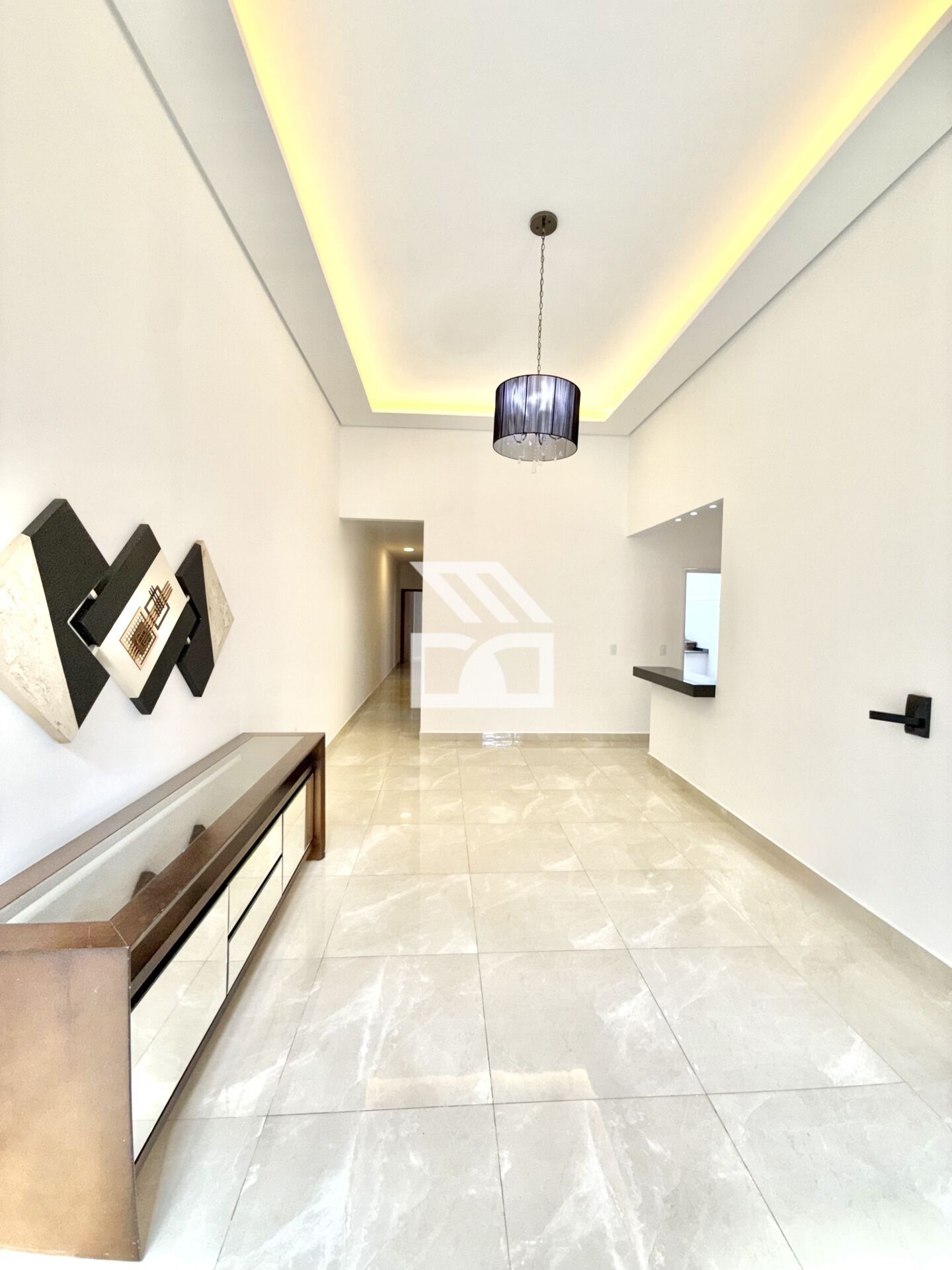 Área social em conceito integrado, sala 2 ambientes com pé direito elevado